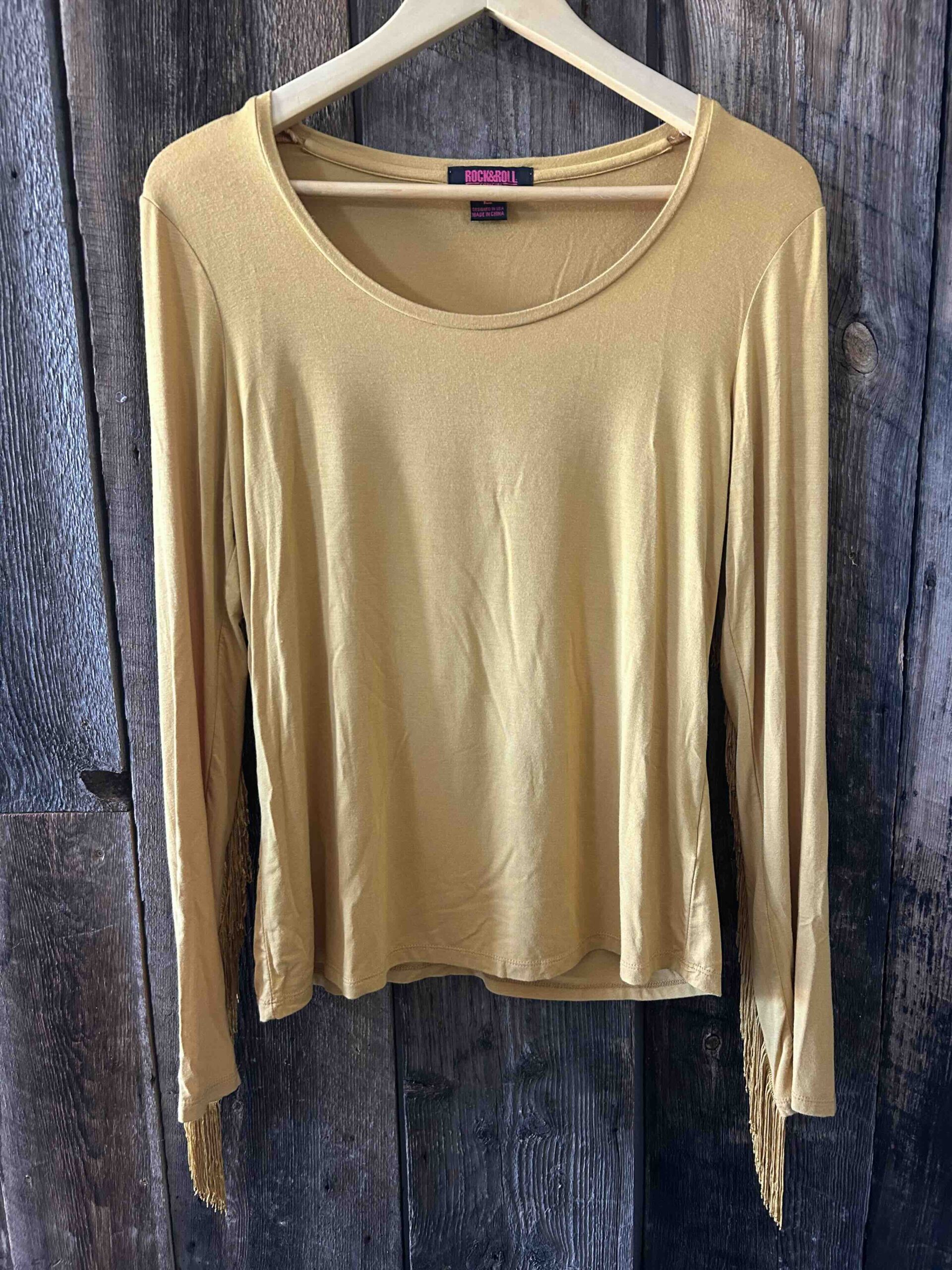 NEW Rock and Roll Cowgirl Gold Long Sleeve Fringe Shirt, size L