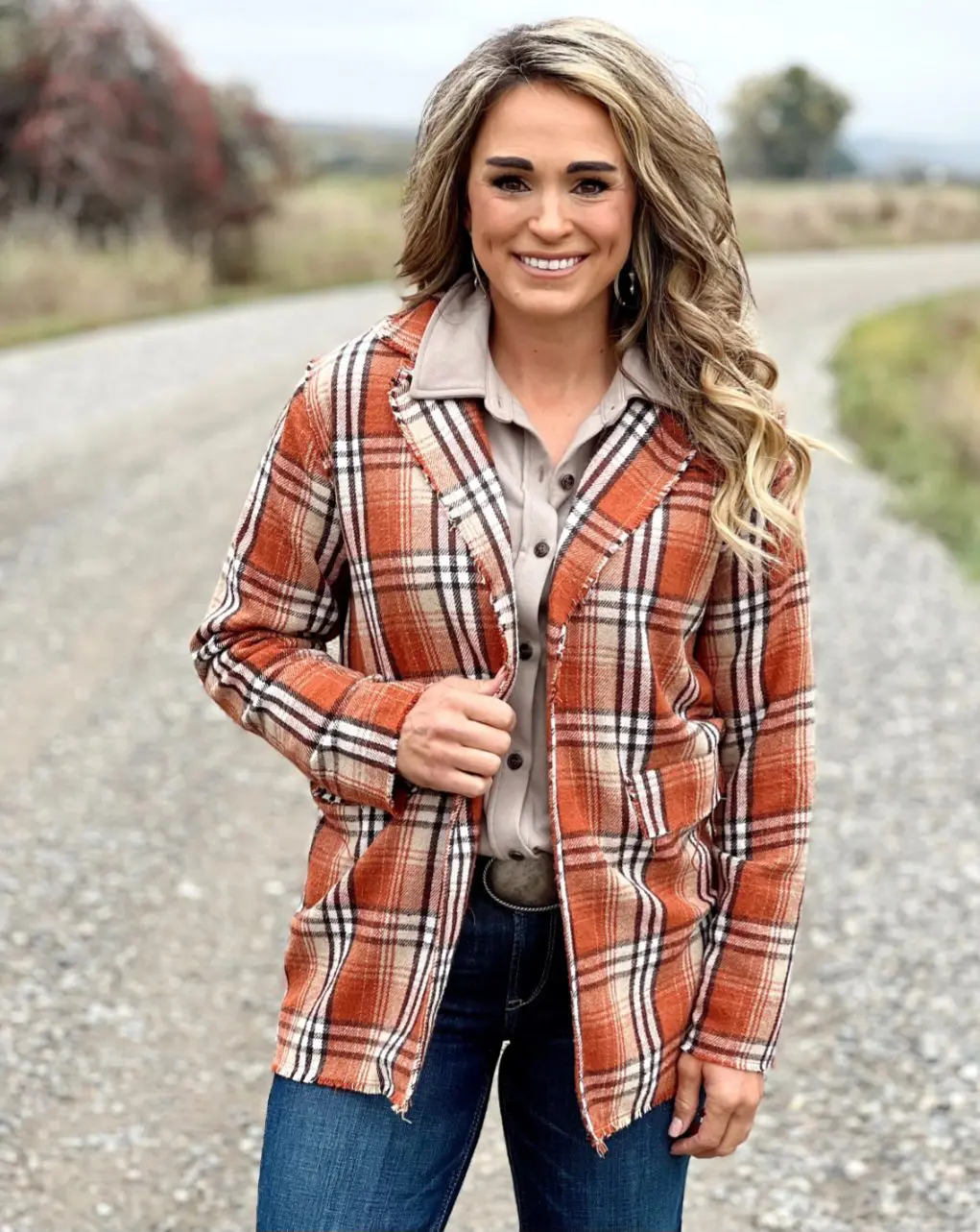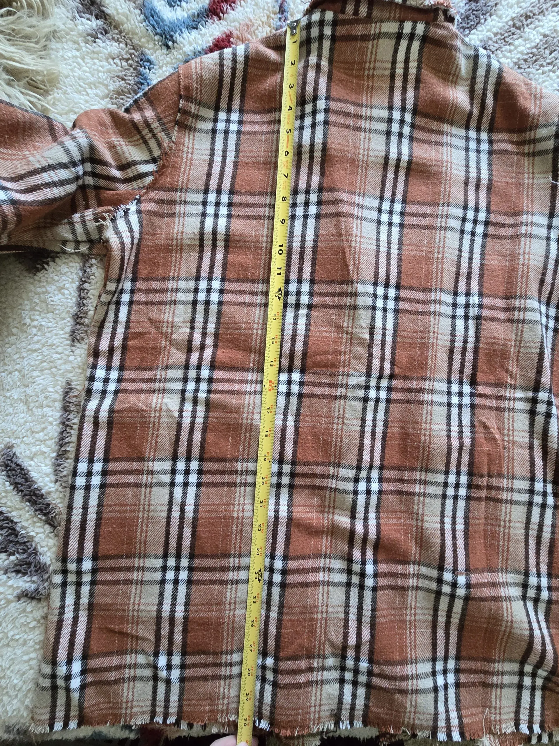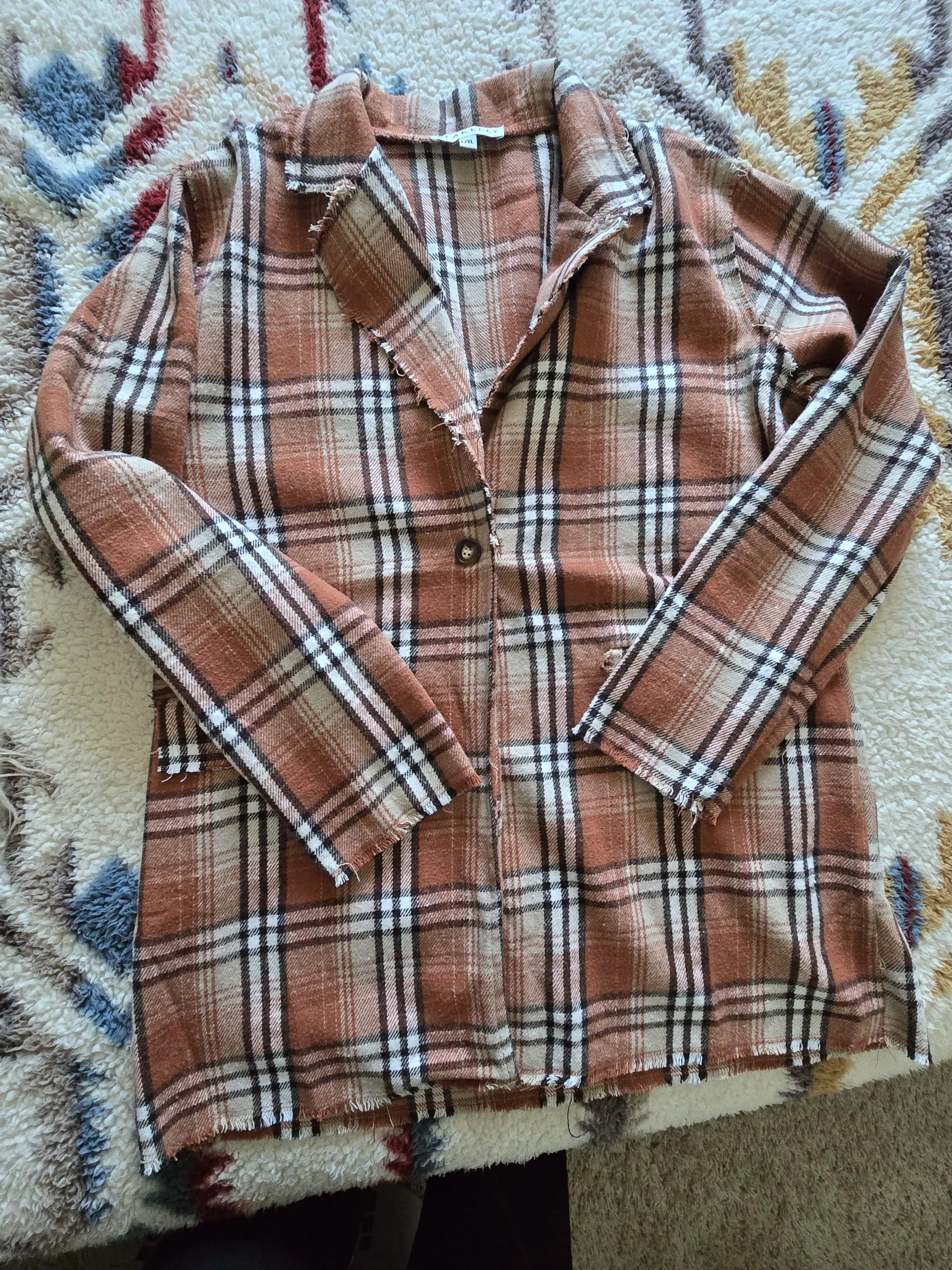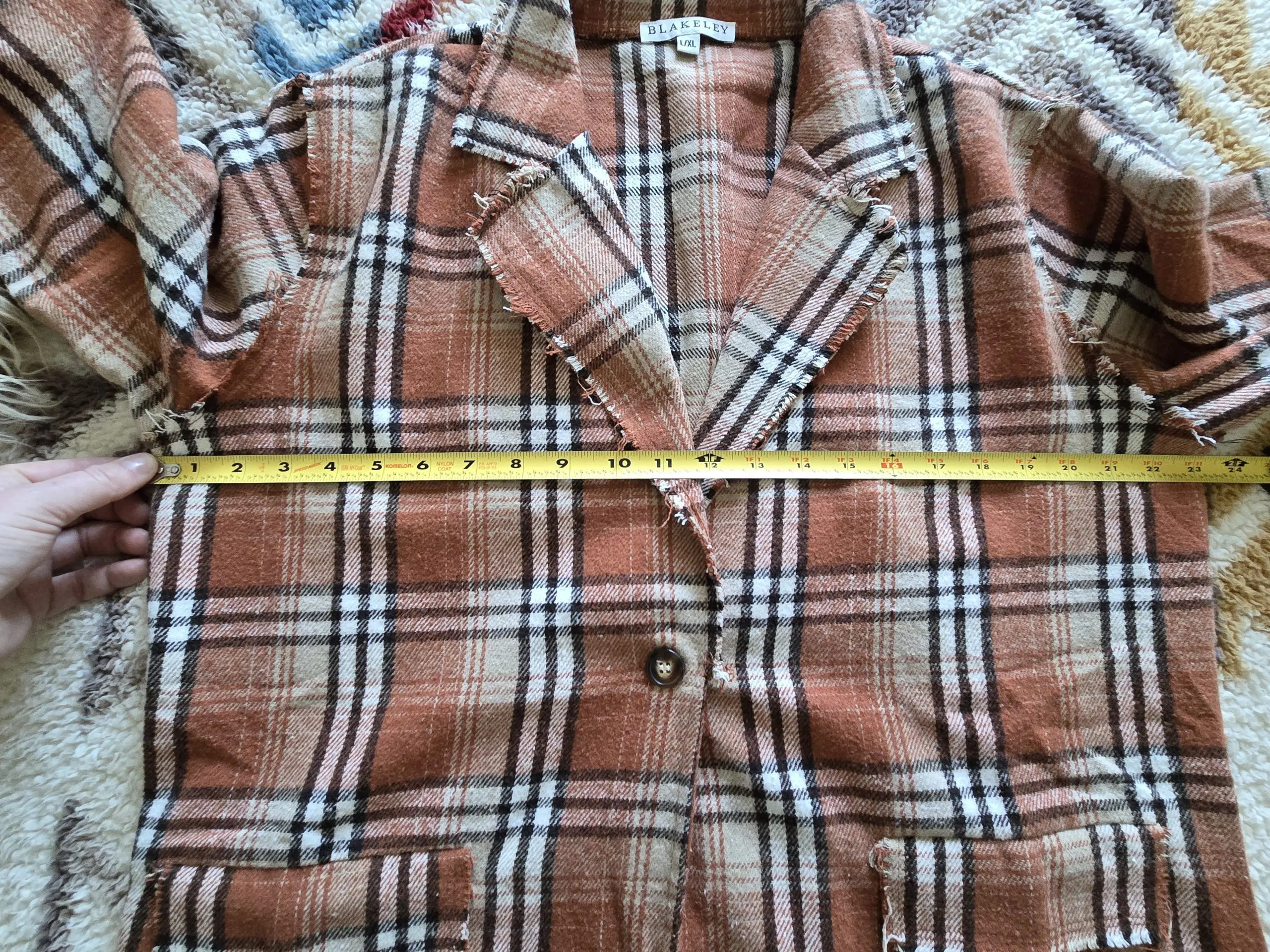 Brand new longer length lightweight blazer with raw edge detail and button closure. No stretch and measurements in pictures.