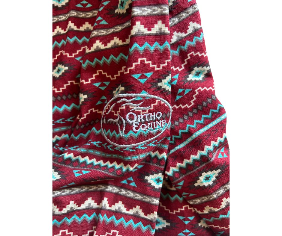 CC Western Signature Pearl Snap Button Up Shirt in Maroon/Rust Turquoise and Brown Aztec Print. Embroidered Ortho Equine logo on sleeve. In good condition. Size Large.