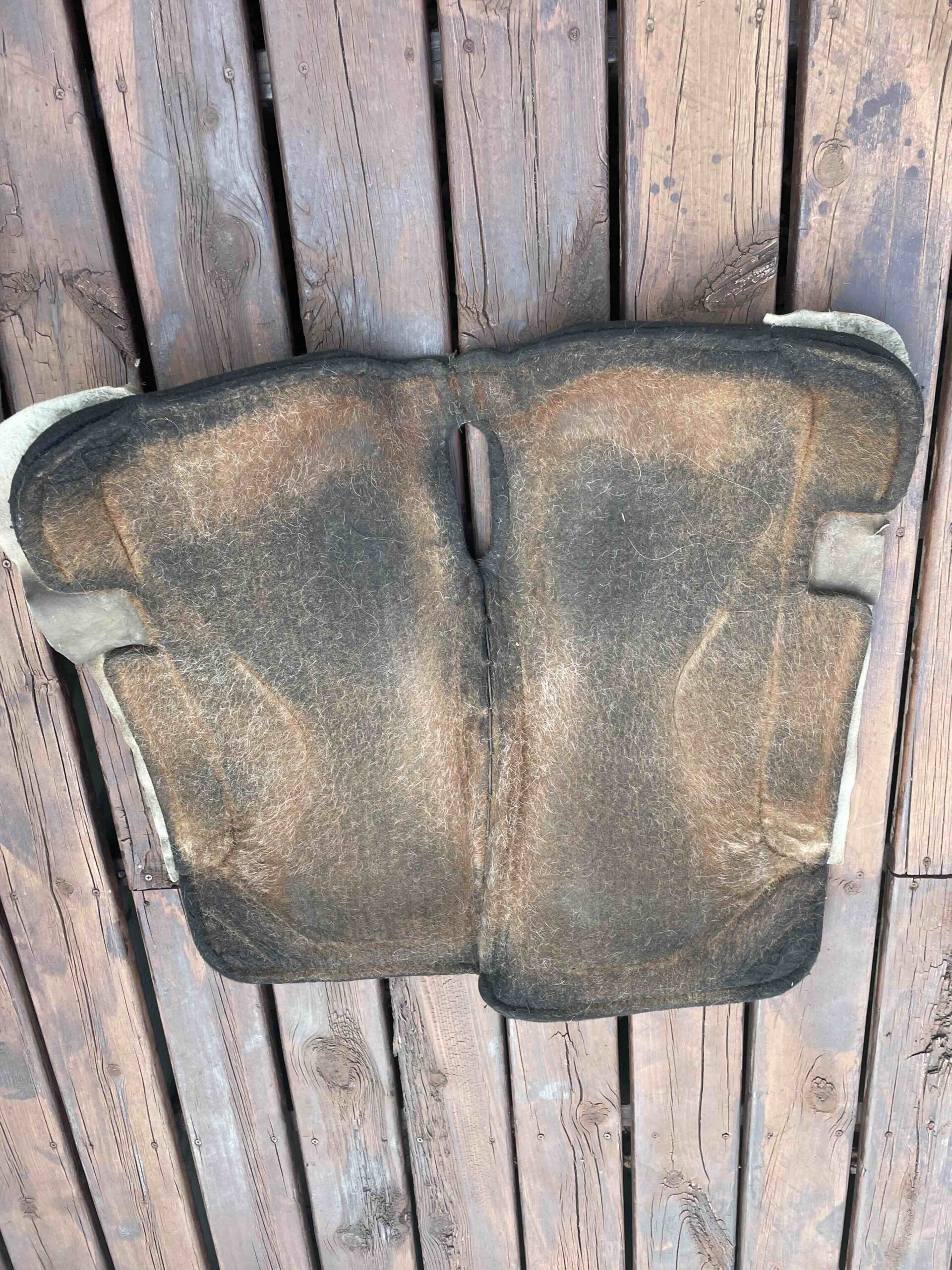 In good used condition. Black with hair on hide wear leather. Some of the hair on the wear leathers has been rubbed off. The Contour Classic saddle pad is the original Impact Gel saddle pad. The technology and fit of this pad was perfected and has been a first choice for riders for fifteen years. The gel bladder is shaped and placed strategically to fit the placement of the saddle. The unique wool blend allows air between the pad and horse, improving circulation. These features provide flexible energy absorbing fit, resulting in high performance, non-slip, non-rollover protection for you and your horse. Heavy duty wear leathers ensure years of durability.