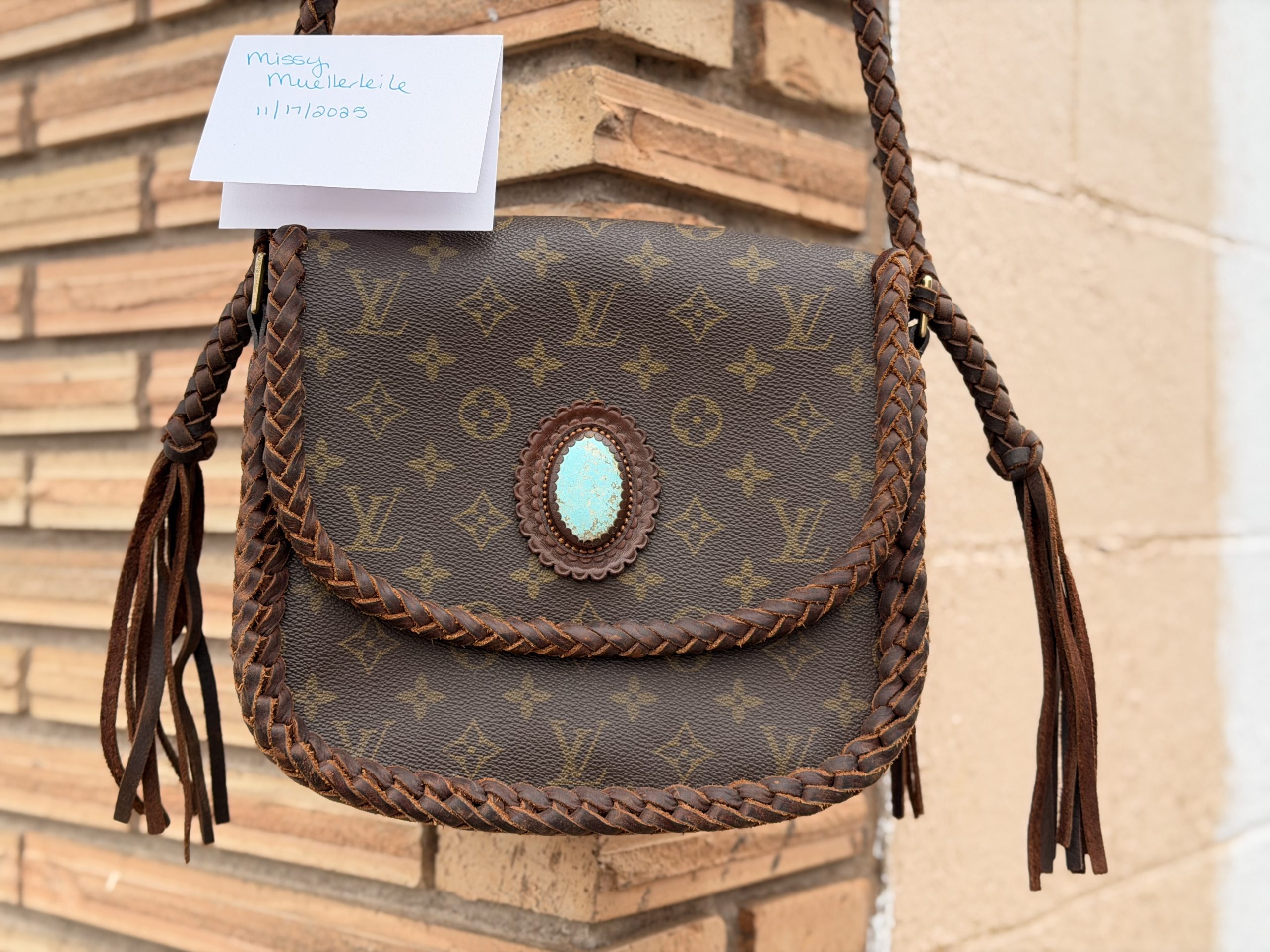 Lightly carried leather and vodka, Louis Vuitton revamp. Comes with dust bag and authenticity papers. This purse new was over $4000. Also features a genuine turquoise stone on the front