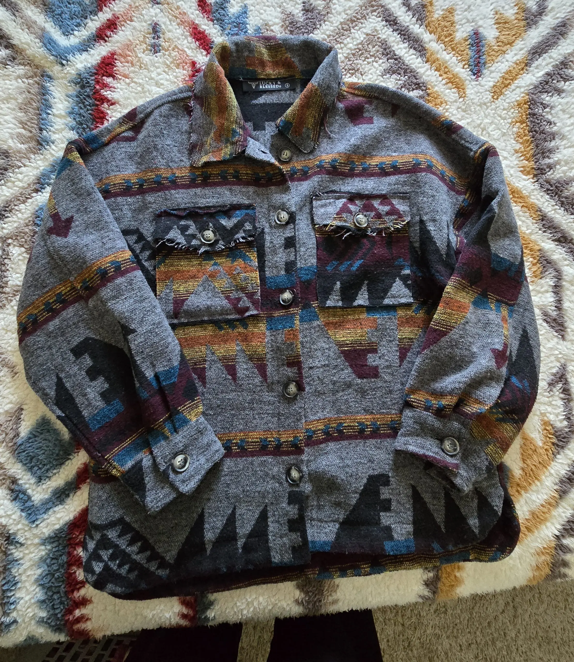 Great condition womens Lucky and Blessed brand shacket oversized small, refer to measurements in photos. Gorgeous colors.
