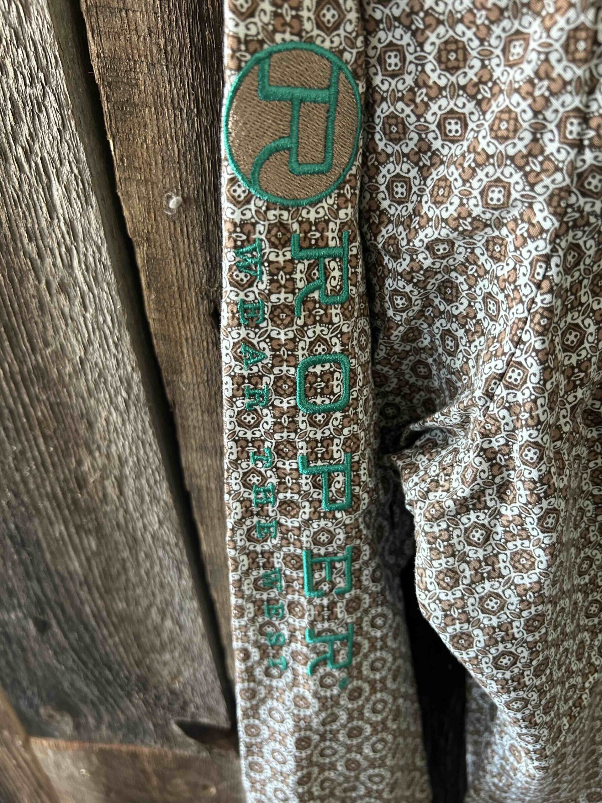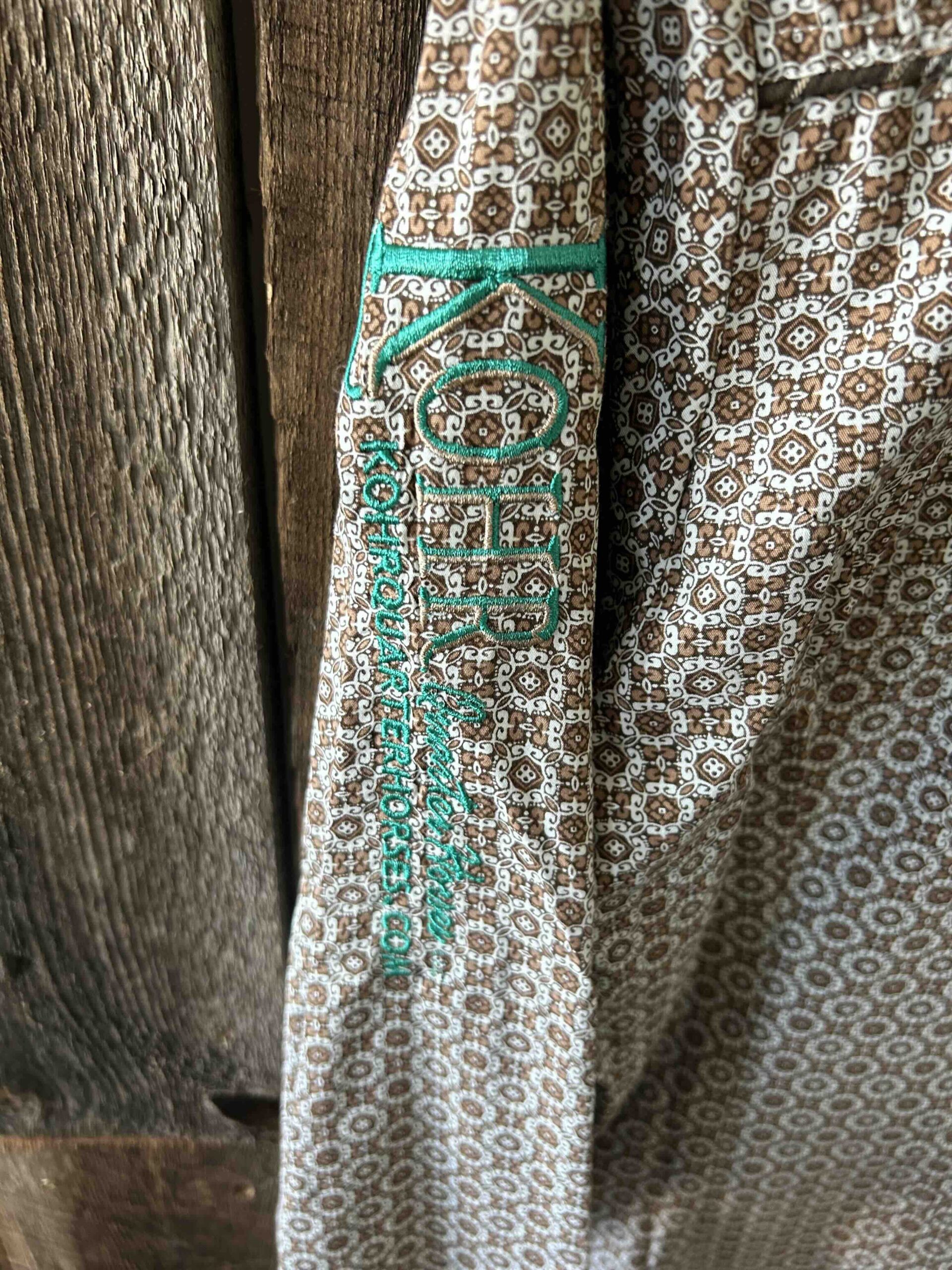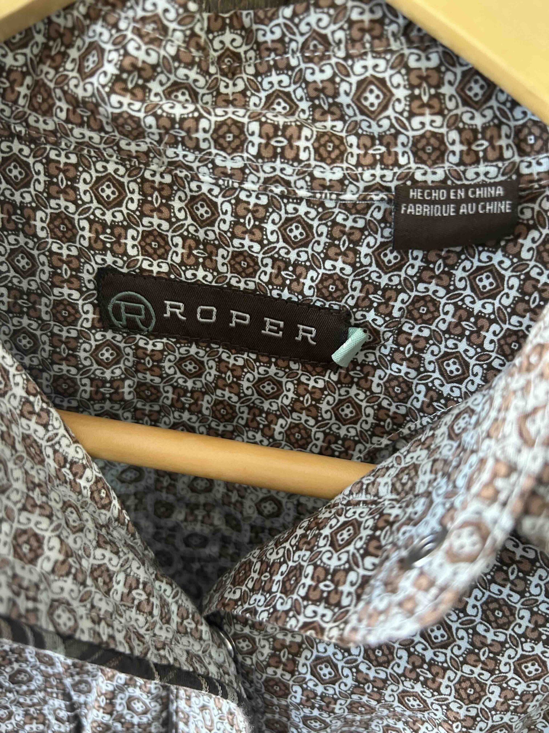 Roper Brown Paisley Print Pearl Snap Western Shirt, size L. Embroidered on sleeves with Roper Apparel logo and Kohr Quarter Horses logo. 100% Cotton. In great condition.