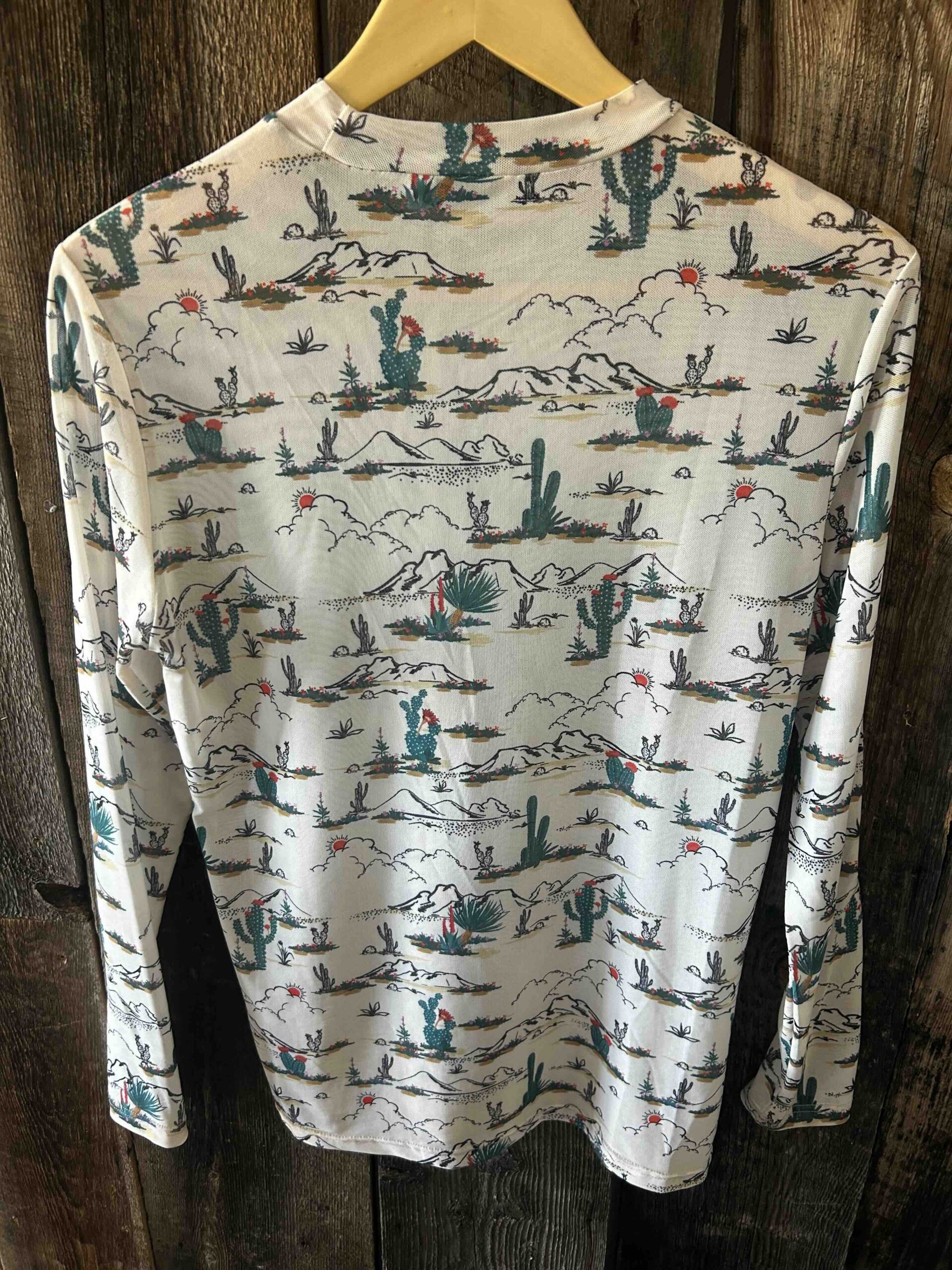 Turquoise Haven Mesh Sheer Breathable Long Sleeve Shirt with Cactus Western Print. Size Large. 97% Polyester 3% Spandex